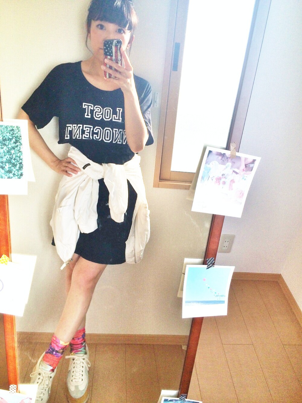 この前のコーデを腰巻きスタイルに このTシャツワンピ切り替えになってて一目惚れ♡