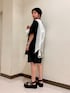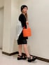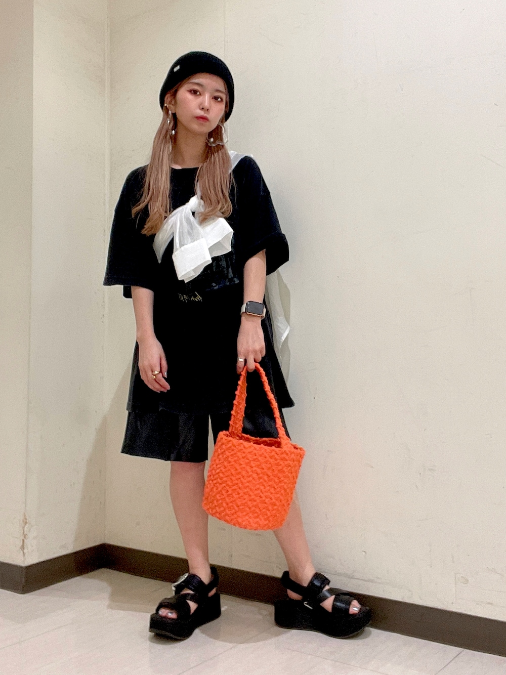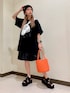 カジュアルコーデ☺︎ ブラックは重く見えるので ボトムはショートにして ヘルシー見せに✨ 白のシアーシャツをたすき掛けや 差し色でオレンジバックを使って 夏らしい印象に❤️