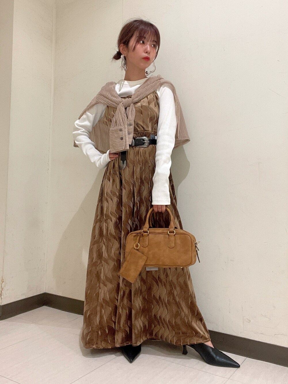 ベロアワンピコーデ☺︎❤️ 着回ししやすいワントーン コーデです✨ ベルトやシューズをブラックで しめてメリハリを出すのもおすすめです💗