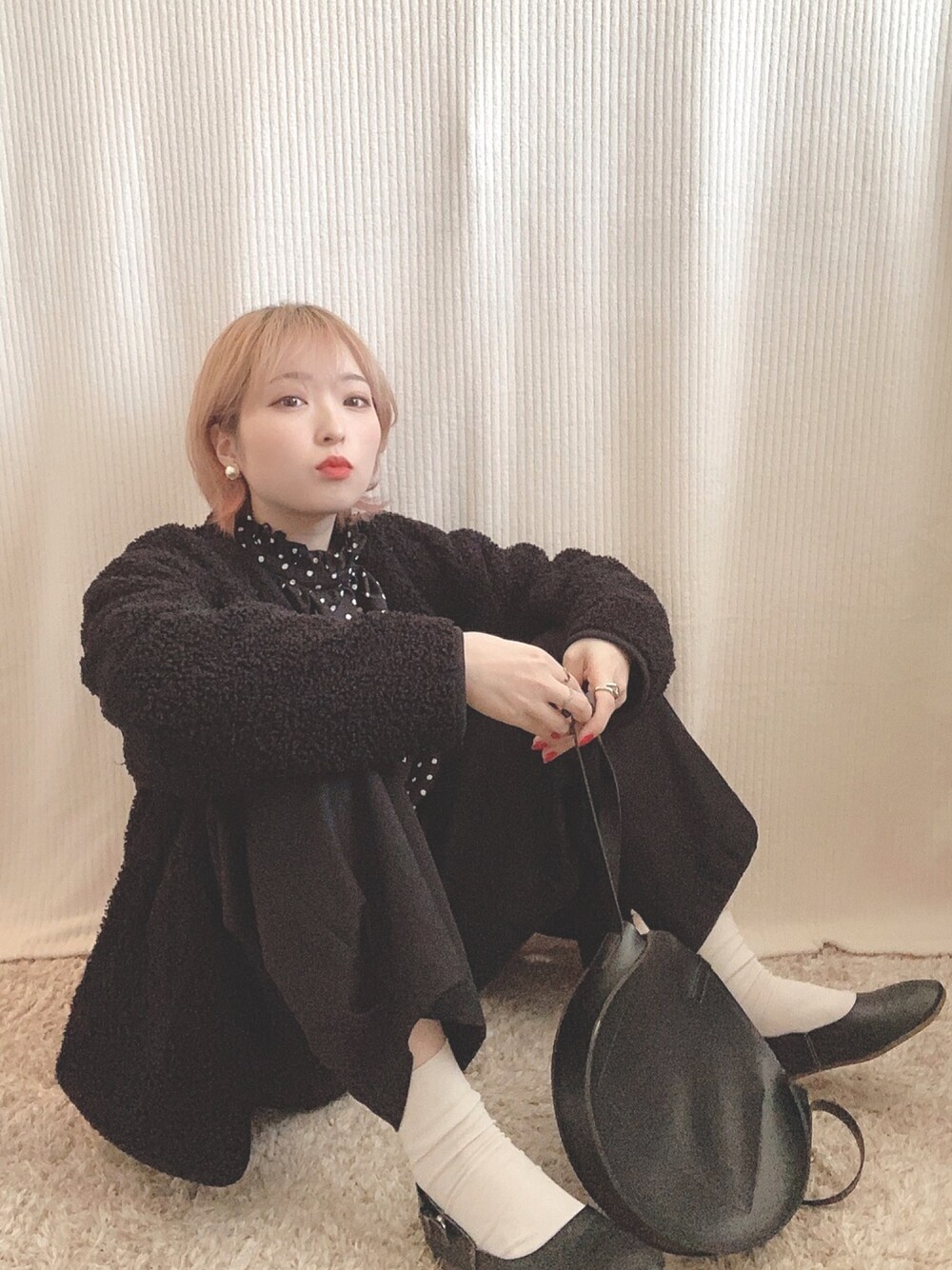 《🐩×🖤》 プチプラモノトーンコーデ ドットブラウスはしまむらの掘り出し物で素材がしっかりしてて高見えするのでお気に入りです◎ ブラウスはインしてます〜UNIQLOのモコモコ可愛い、、❤︎