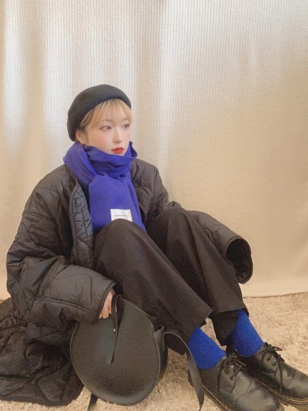 《🎱×💙》 アウターの下はタートルネックのシースルートップスにノーカラーシャツワンピの黒をレイヤードさせてます◎