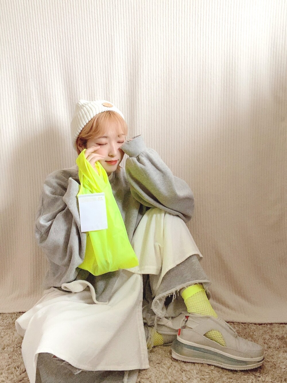 《🐰×☁️×🎾》 白のシャツワンピにビッグシルエットのスウェットをレイヤードさせてます✌🏻 スウェットとパンツのきりっぱなし感を揃えてセットアップ風に🐰 アクセントで蛍光イエローを 靴下は白の靴下の上にアミアミ靴下を重ねてます🧦