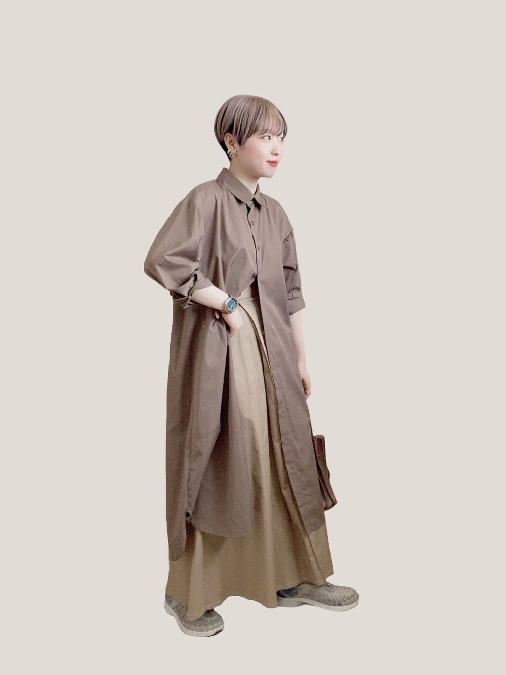 《🦔》 ブラウンコーデ🍂 シャツワンピはウエスト部分までボタンとめて残りは開けて着るのがポイント〜