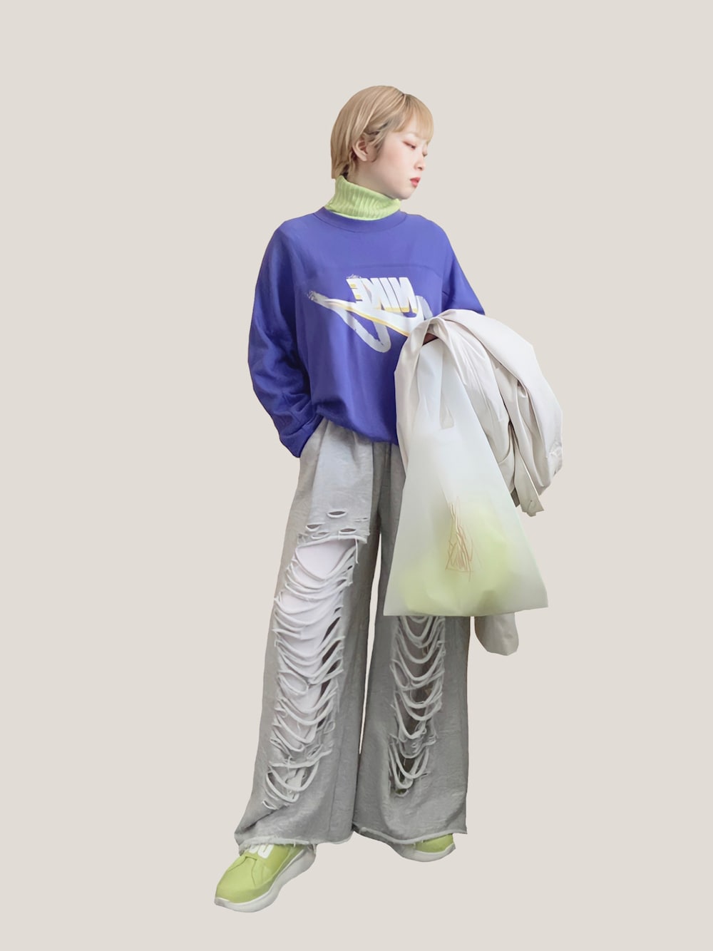 《💙×🎾×🐭×☁️》 ワイドなダメージスウェットパンツの下に白のタイツをレイヤード⚡️