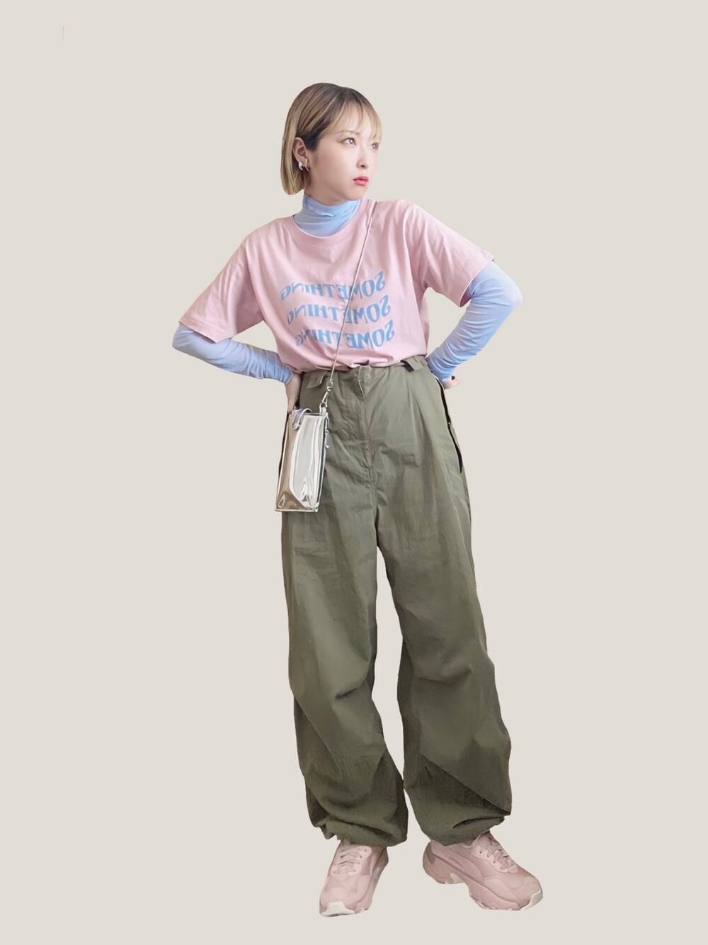 《🌐×🌸×🪖×💿》 Tシャツの文字とシアートップスのカラーを合わせた💠 パステルかわいいミリタリーコーデ完成〜✌🏻💗