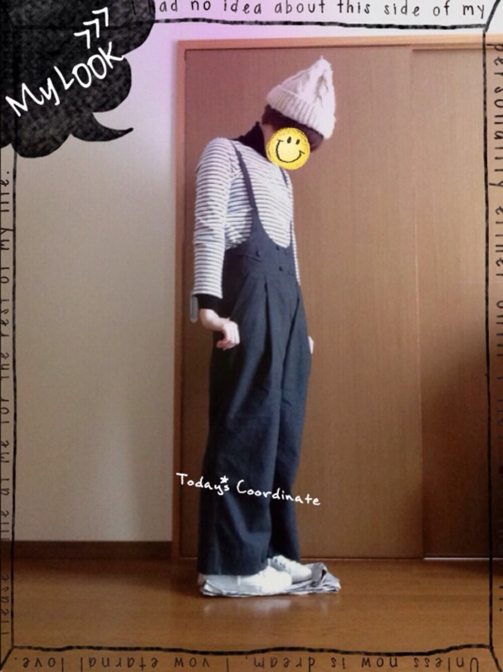 ワイドパンツ:JEANASIS ボーダーカットソー:ユニクロ タートルニット:ユニクロ スニーカー:無印良品 ニット帽:tout a coup