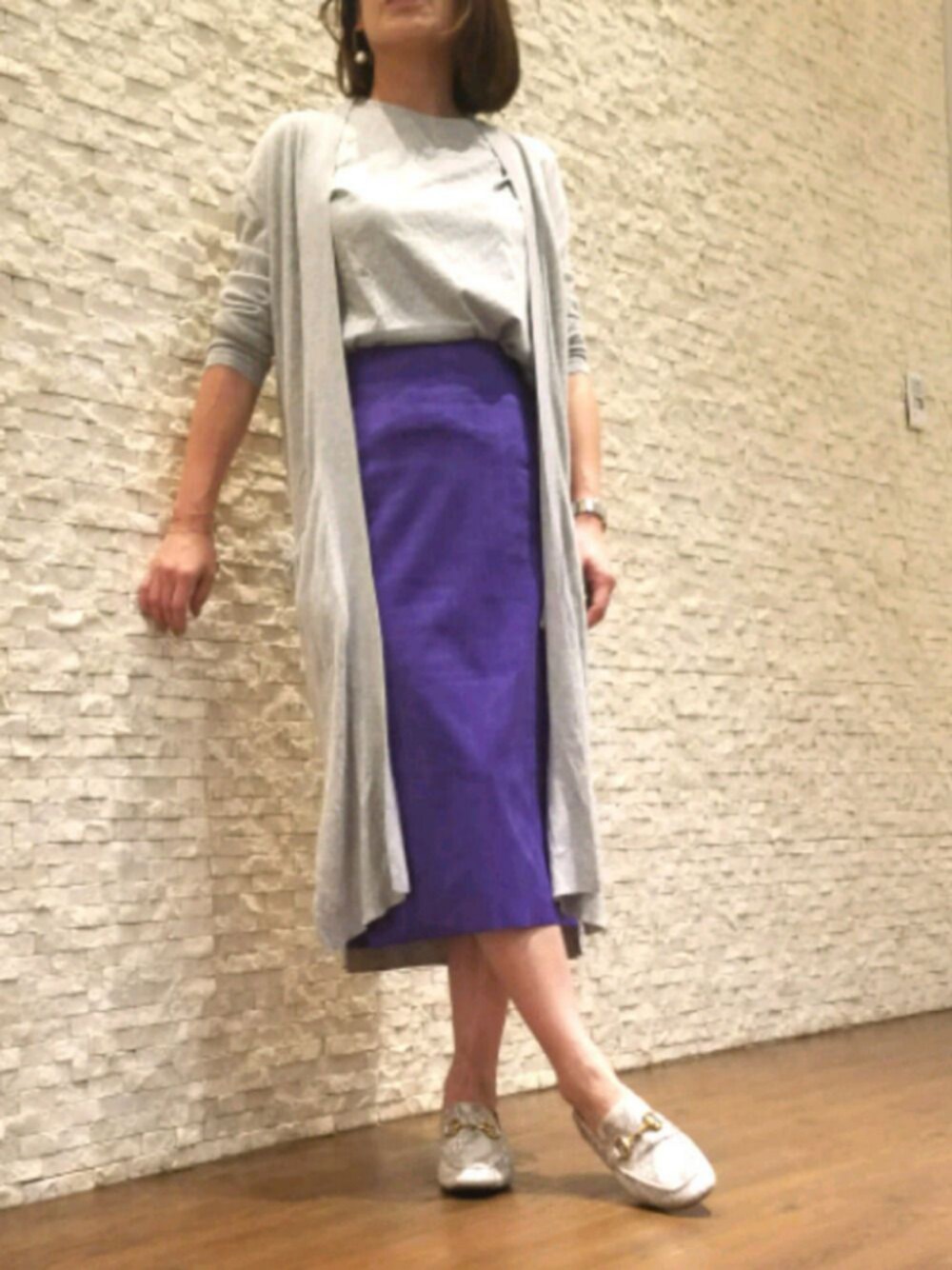 秋っぽく フェイクスエードのスカート ノースリーブTとローファー をあわせたカジュアルstyle パイソン柄のビットローファー はお気に入りの1足