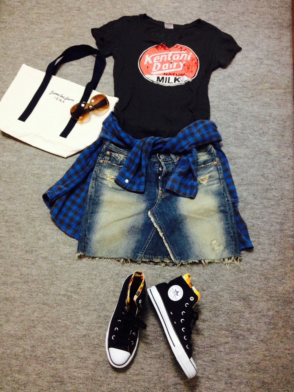 Tシャツ: moussy スカート: リーバイスリメイク シャツ: ブランド不明 靴: CONVERSE