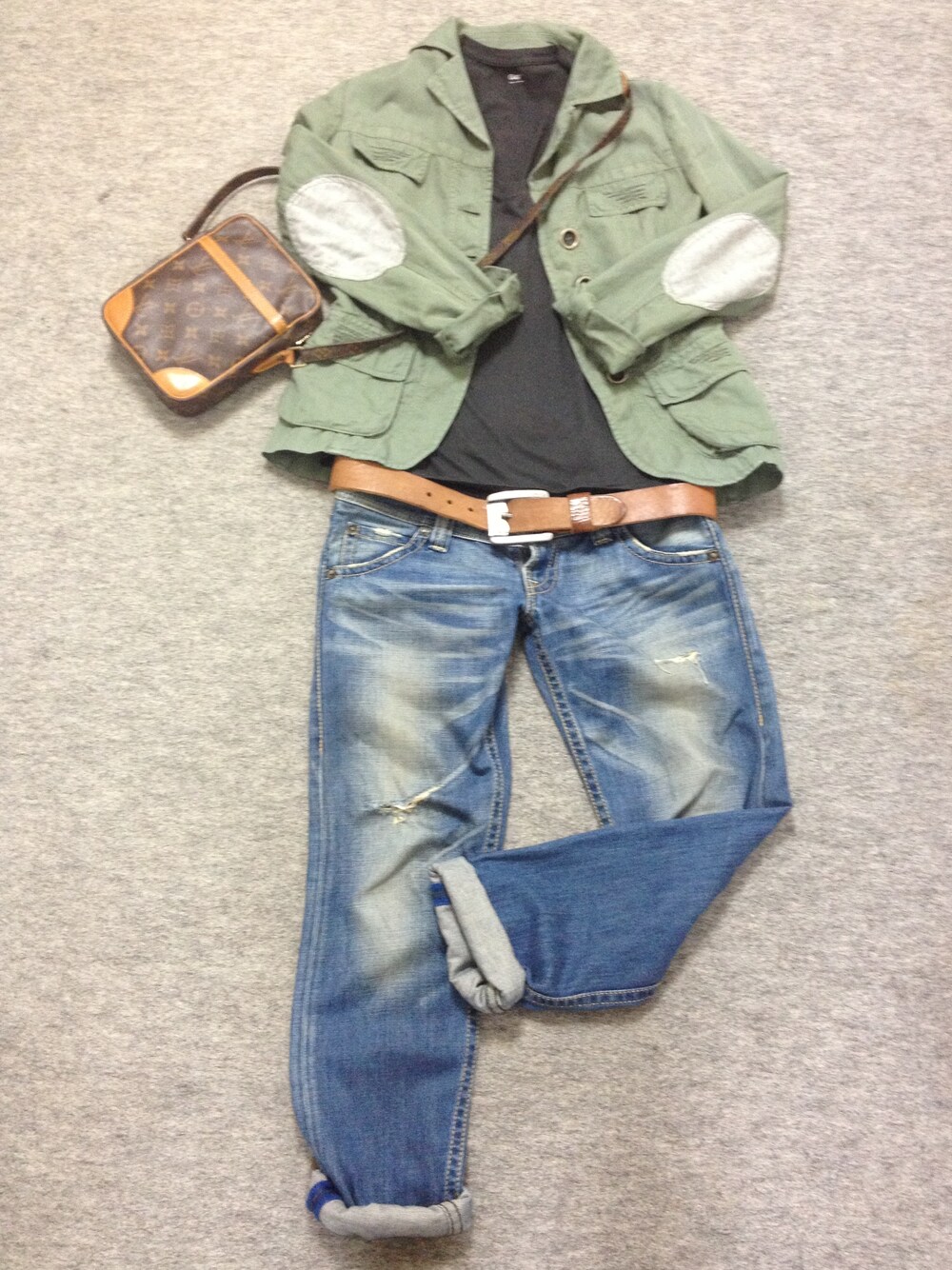 ジャケット: ベネトン ジーンズ: RODEO CRWNS Tシャツ: GAP ベルト: DIESEL カバン: LOUIS VUITTON