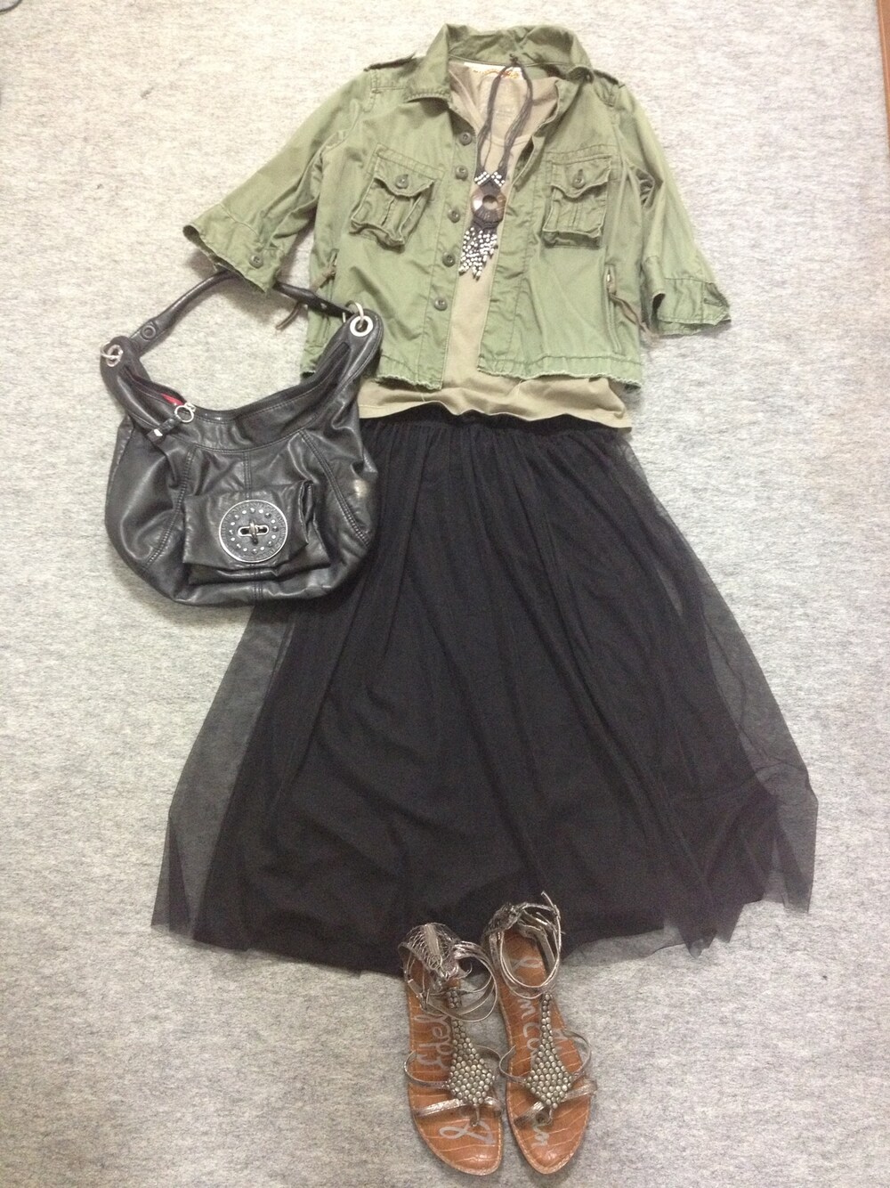 ジャケット: RNA Tシャツ: GU スカート: GU サンダル: Sam Edelman ネックレス: ブランド不明 カバン: DIESEL