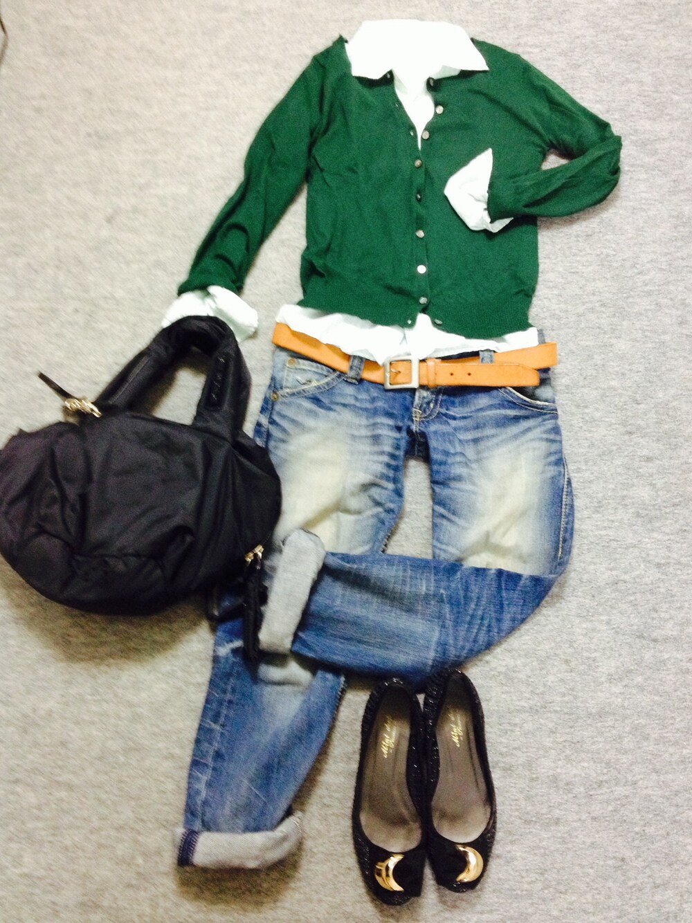シャツ: H&M カーディガン: ブランド不明 ジーンズ: RODEO CROUNS ベルト: ブランド不明 靴: ブランド不明 カバン: SEE BY CHLOE