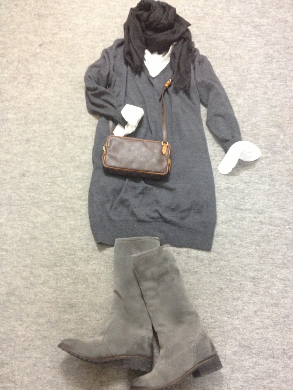 ワンピース: UNIQLO シャツ: H&M ブーツ: DIESEL ストール: GU カバン: LOUIS VUITTON