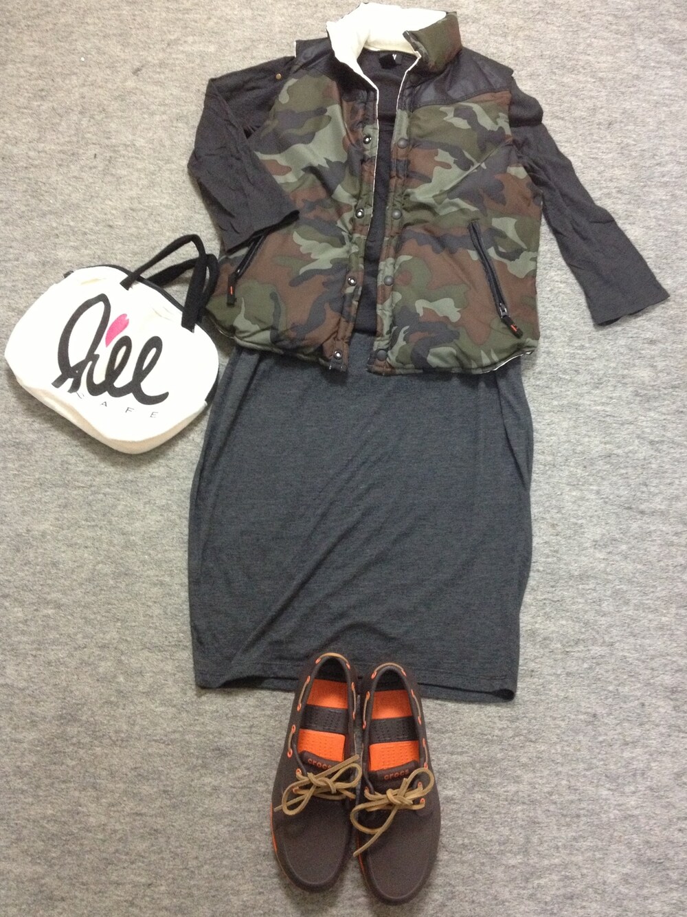 ワンピース: ZARA ロンT: H&M ダウンベスト: ブランド不明 靴: crocs カバン: 付録