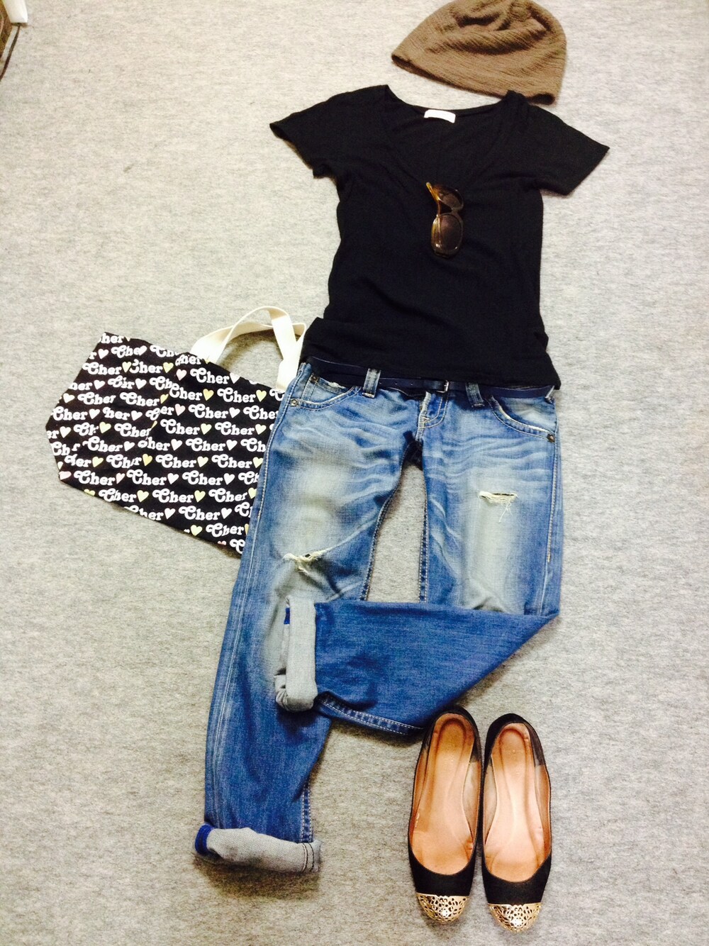 Tシャツ: Azul by moussy ジーンズ: RODEO CROUNS 帽子: ブランド不明 ベルト: ZARA 靴: ブランド不明 カバン:
