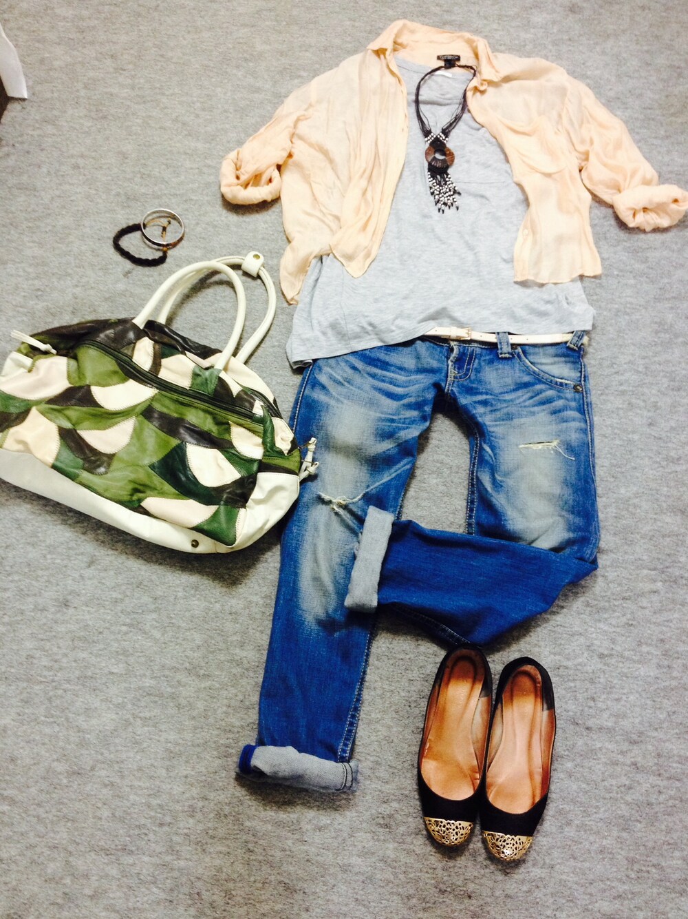 シャツ: TOP SHOP Tシャツ: GU ジーンズ: RODEO CROWNS 靴: ブランド不明 カバン: