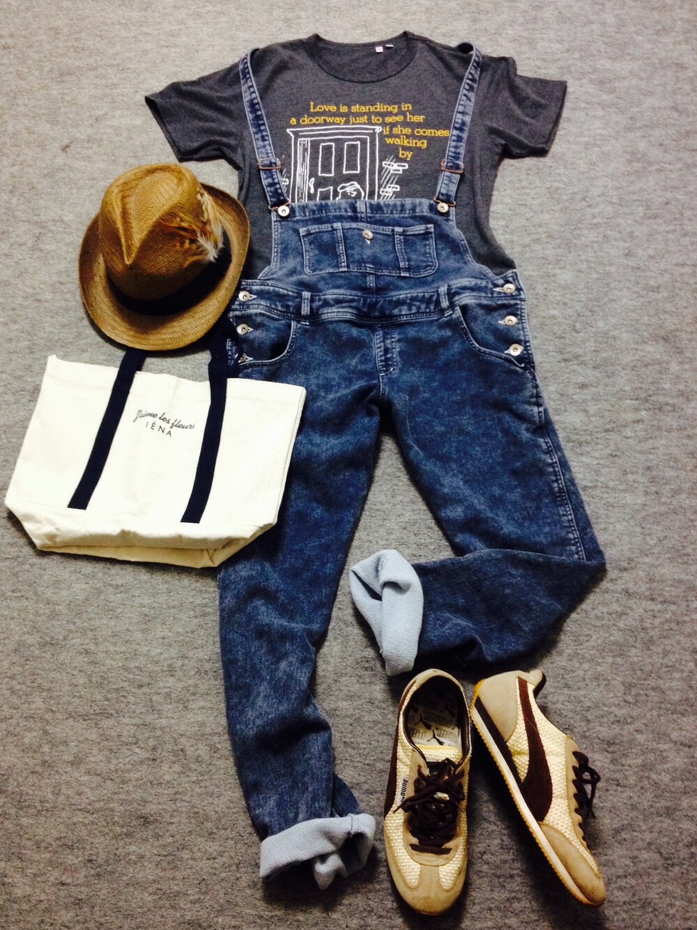 Tシャツ: UNIQLO オーバーオール: ブランド不明 スニーカー: PUMA 帽子: ブランド不明 オーバーオールは、スウェット素材でスゴく着やすくてお気に入り•̤ᴗ•̤