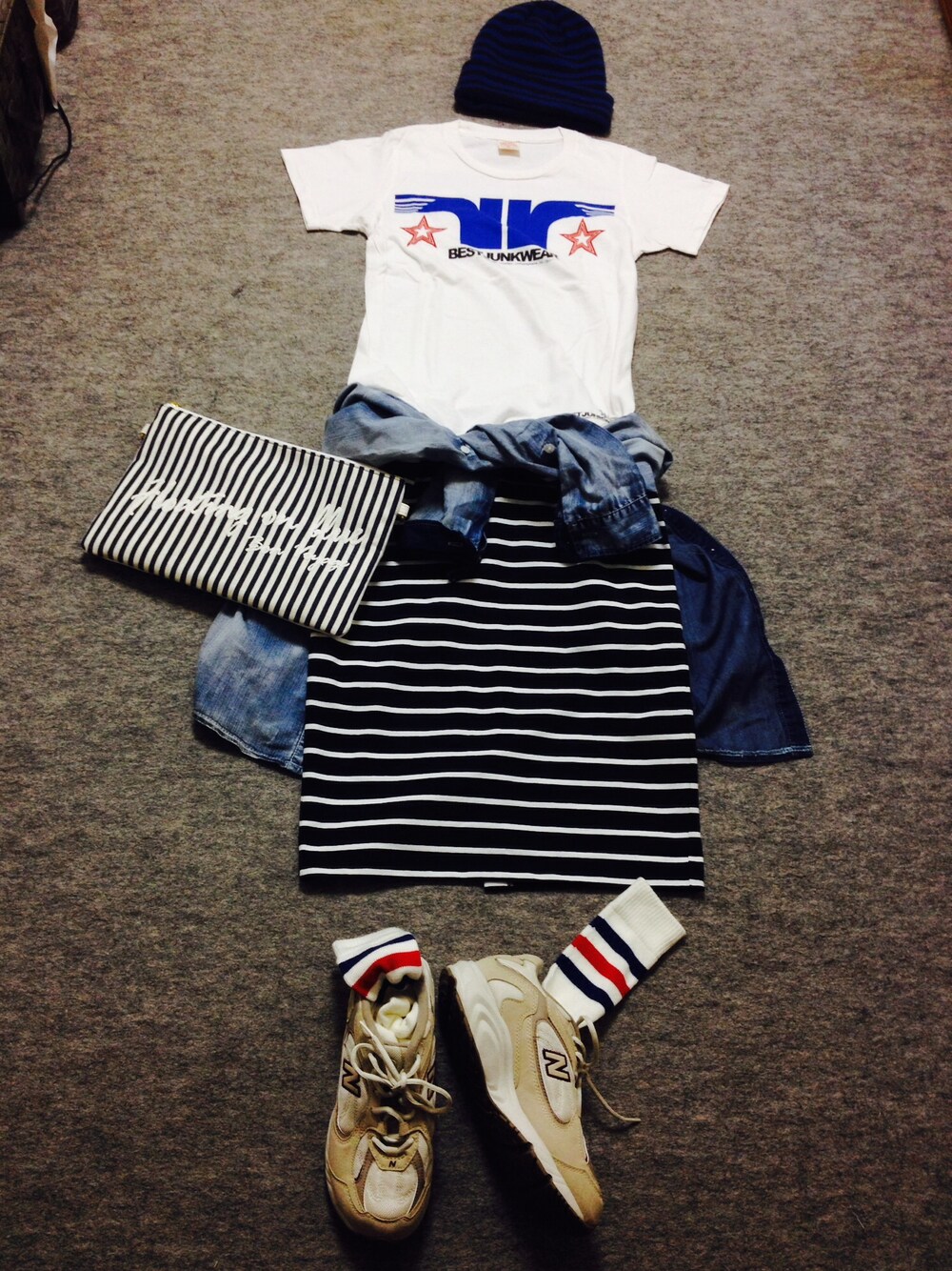 Tシャツ: RNA スカート: UNIQLO シャツ: ブランド不明 スニーカー: NEW BALANCE