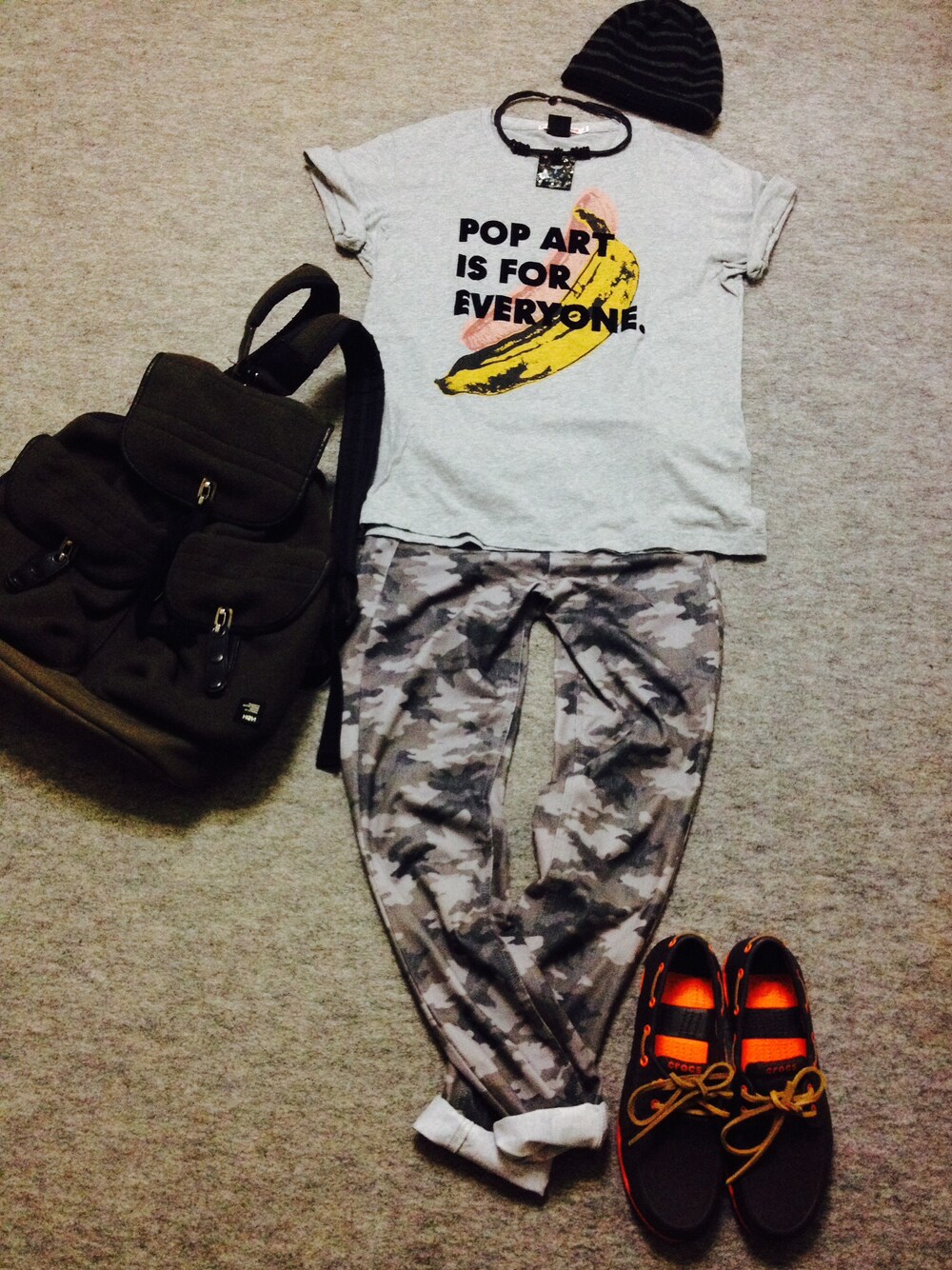 Tシャツ: UNIQLO パンツ: ブランド不明 靴: crocs カバン: HeM