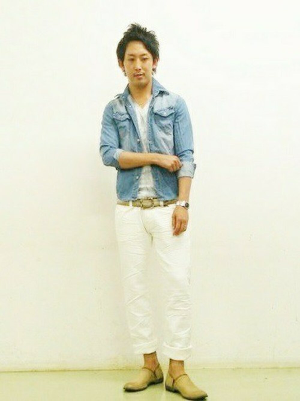 デニムシャツ特有のヴィンテージ感を活かしたスタイリング。 またロールアップすることにより、清涼感のある形に仕上がる。