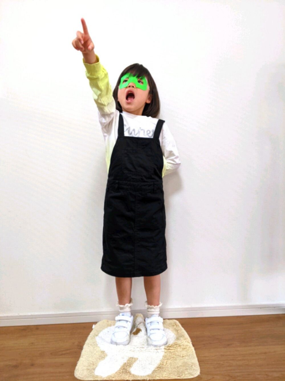 ご覧頂きありがとうございます! 次女 117cm ガチャピン風メガネを作ったらしいです🐼 H&Mのトップスは裾と袖にかけてイエローにグラデーションっぽくなっていて可愛いです。 黒のジャンバースカートは何でも合います♥️