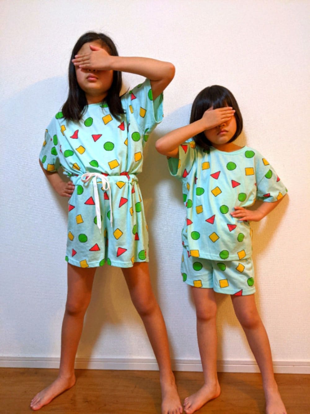 お久しぶりです! ずっと欲しがっていたクレヨンしんちゃんパジャマデビュー👏 姉 身長137cm→160cm着用 妹 身長117cm→140cm着用 パンツは紐で調整できます! シャツ、イン派とアウト派😂