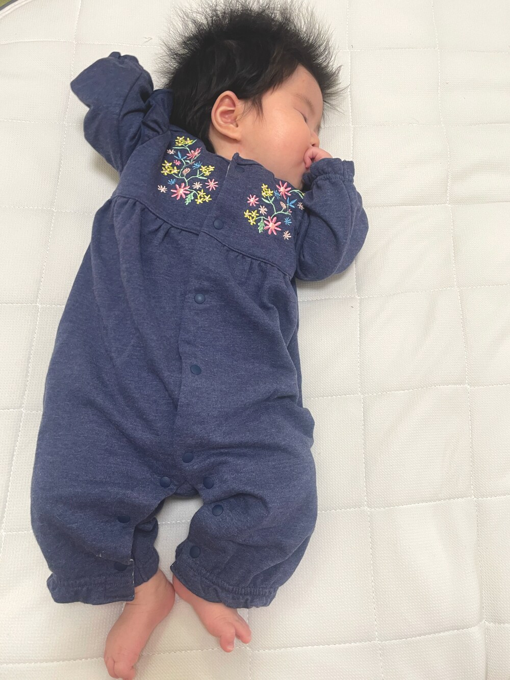 3ヶ月ベビー⭐︎ 着用サイズ 70cm 胸元の刺繍が可愛い! 白も売っていて悩みましたが紺にしました。 今からお散歩です👍 最近、暑いので長袖ロンパースも着る機会が少なくなるかと思うと寂しい🥺
