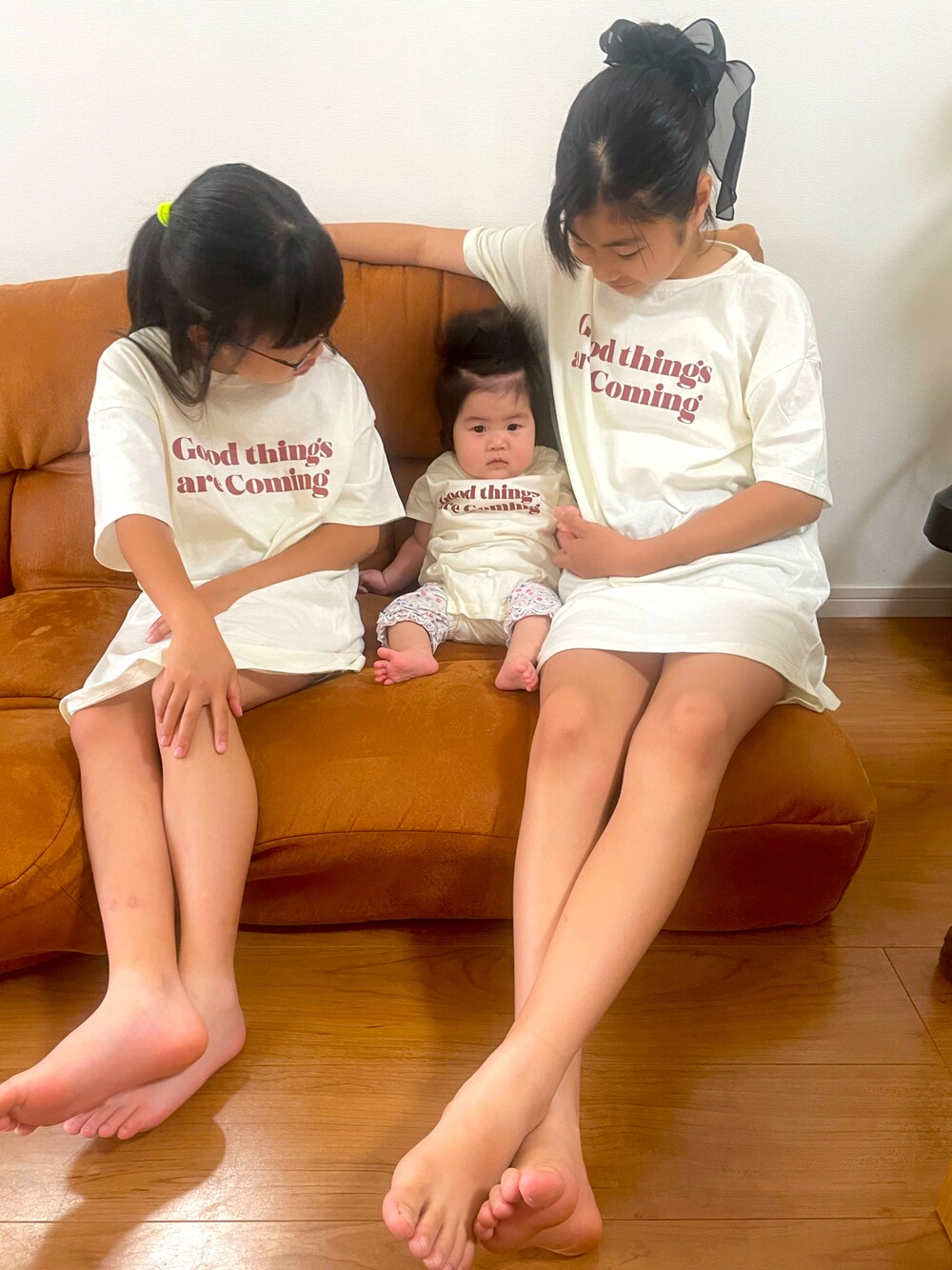 三姉妹お揃い! 姉 148cm 150着用 妹 128cm 130着用 赤ちゃん 5ヶ月 80着用 姉達はTシャツワンピースです。 プチプラなのにサイズ展開幅広く 可愛いデザインたくさん!