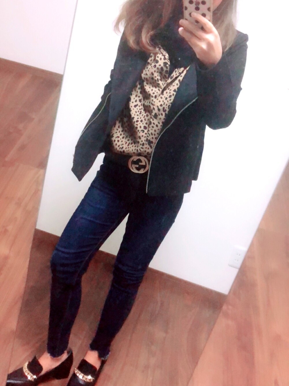 ヒョウ柄〜🐆✖︎ライダース 見えにくいけど シャツからタートルニット出してるからあたたかーい❤︎ またお気に入りのコーデ増えた🤭