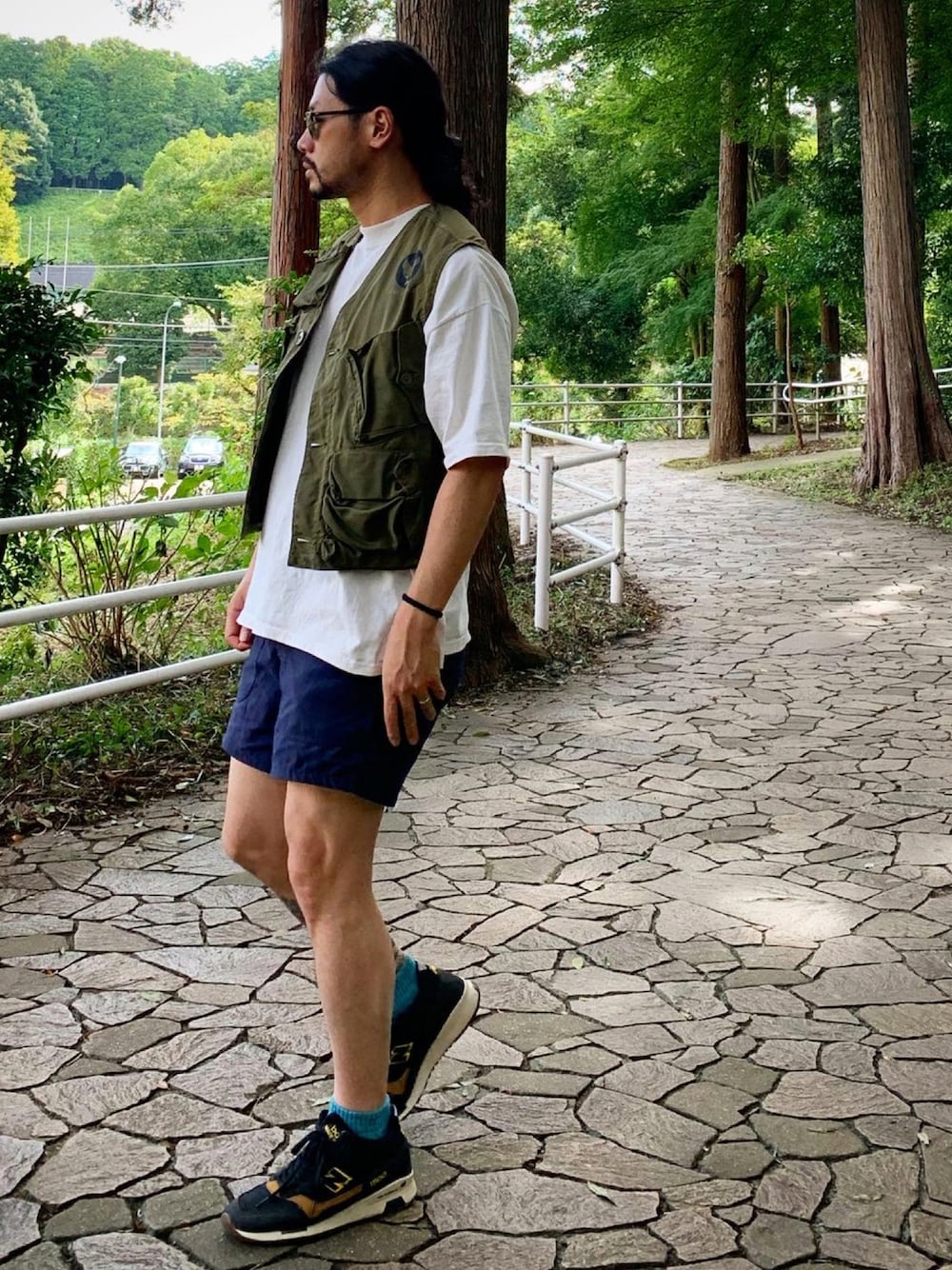 グリーン系のベストを着用したメンズの秋コーディネートの1枚目の写真