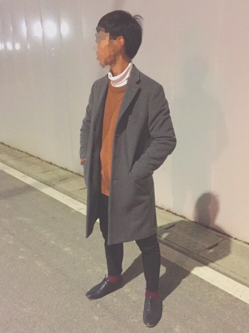 チェスターコートの中にハイネックにセーターを着込んだコーディネートです。 【サイズ】 コート•M セーター•M ハイネック•M パンツ•28 シューズ•28