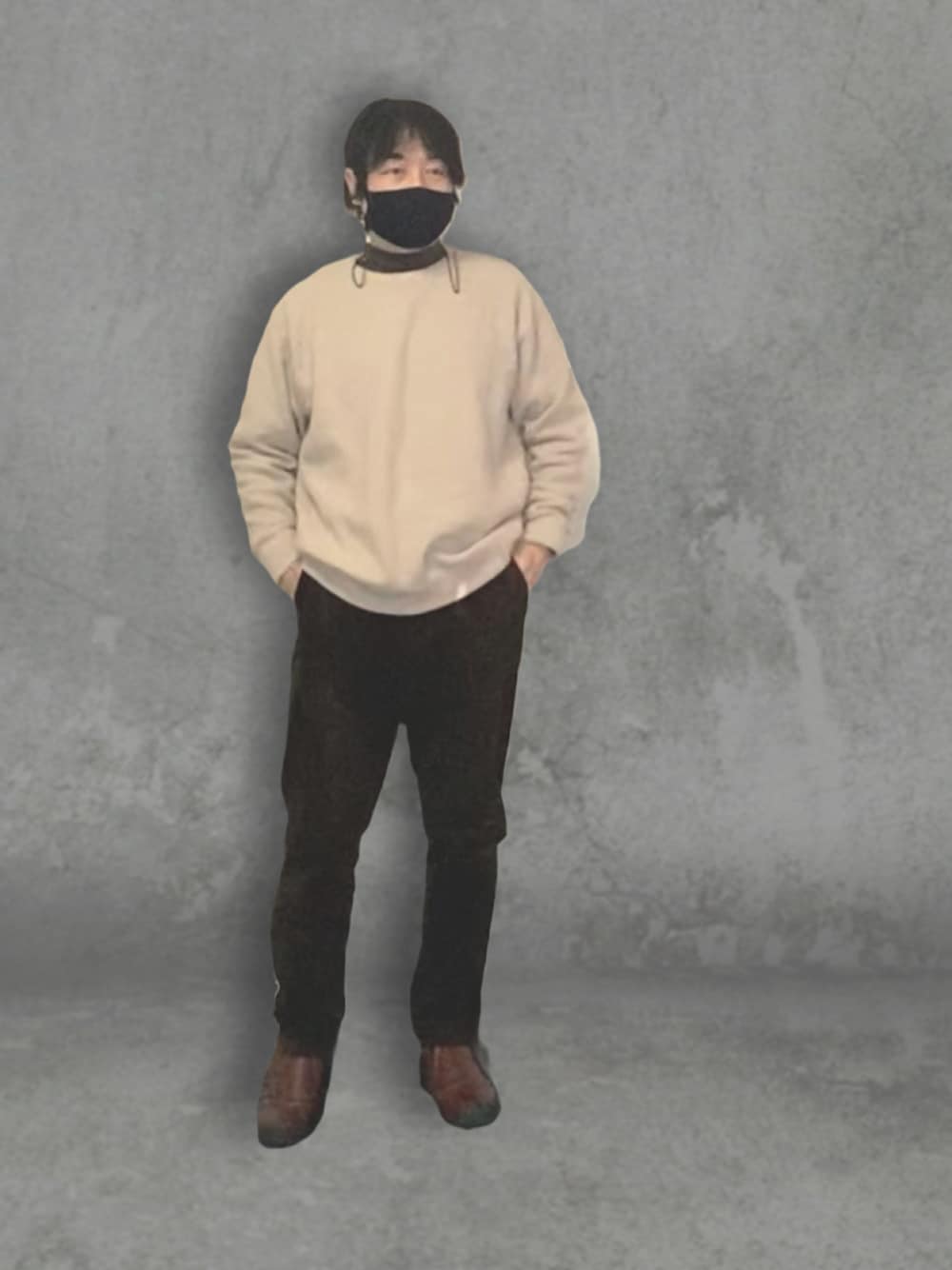 ショッピングモールで食事の格好。 背景は合成。 ARKはじめて行ったけど感じの良い店員さんだった。 マスクチェーンはマスク紐を潰したくなくて取付部に丸いリングを付けたのでピアスみたいになった。