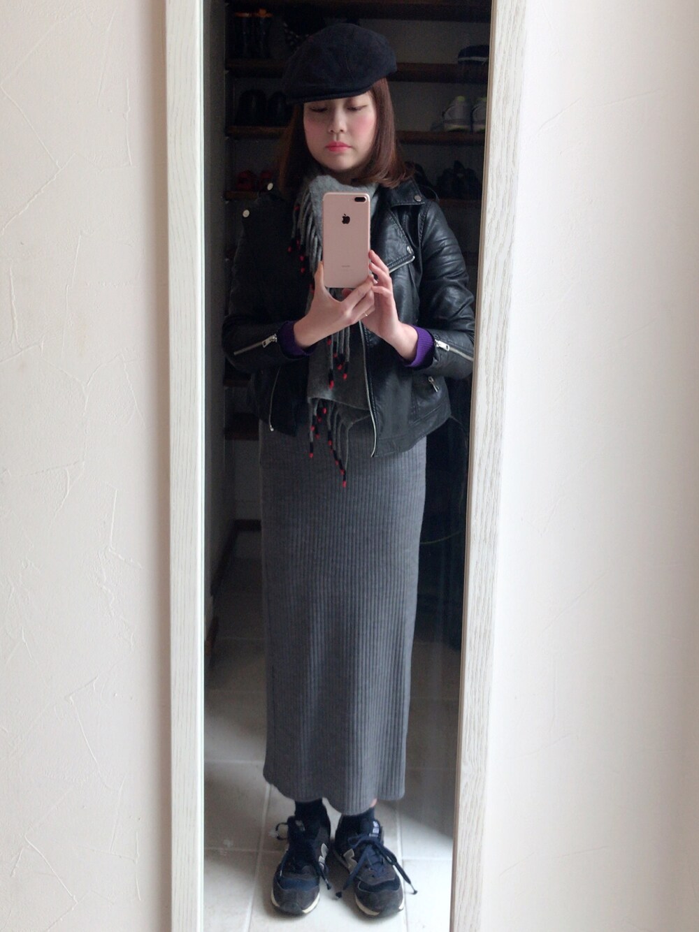 中は紫色のVネックニットです。 なんか毎日コーデが地味やなあ…。
