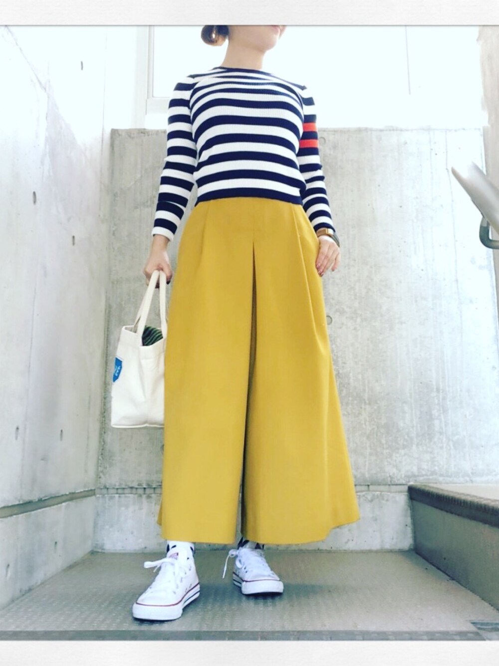 トップスが短めなので、脚長効果を期待して( ͡° ͜ʖ ͡°) トップスの、オレンジのポイントがお気に入りです。