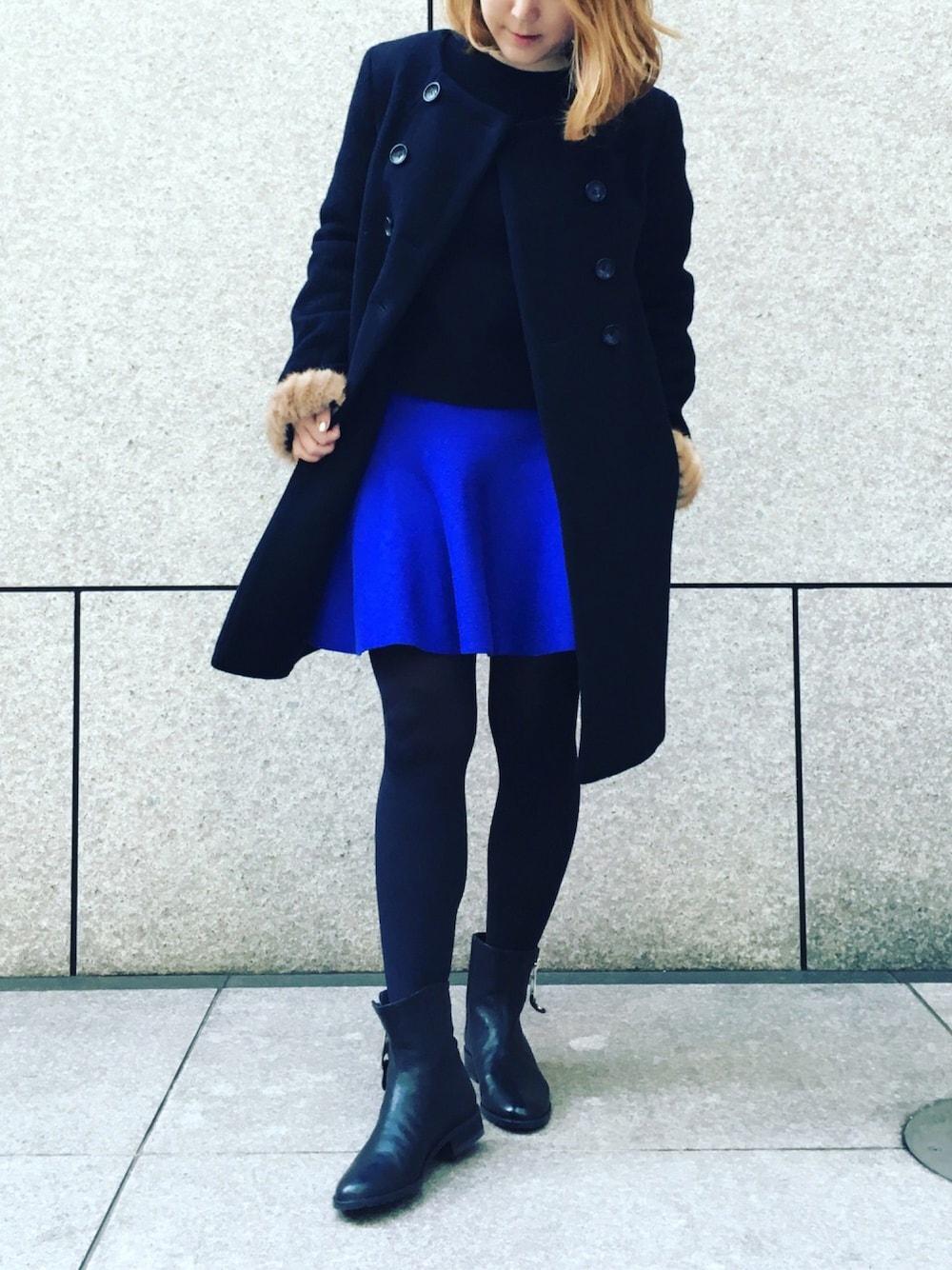 黒タイツを履いたのでいつもより足の露出?が可能に(╹◡╹) 黒x青で2色のシンプルコーデです。 袖のファーは、DIYで、つけてみました。