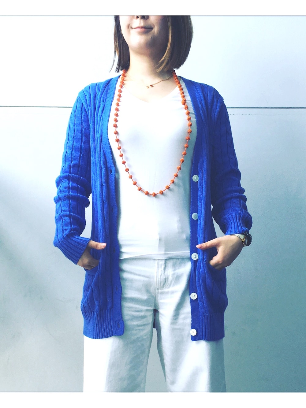 アウトレットで買った青のカーディガンを引き立たせたいとおもったらオールホワイトコーデに…!