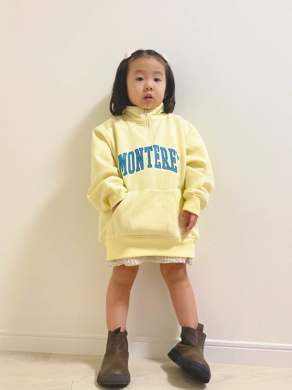 そういえば思い出した! ハイネックって問答無用で可愛いんだった! と昨年イエローニットのハイネックがかわいい❤️🔥だったのを思い出したので、今年は裏起毛のロゴにしました。 スカッツを合わせたのでオーバーサイズの110cmが◎ 本人もふわふわ〜と喜んでいました❤︎
