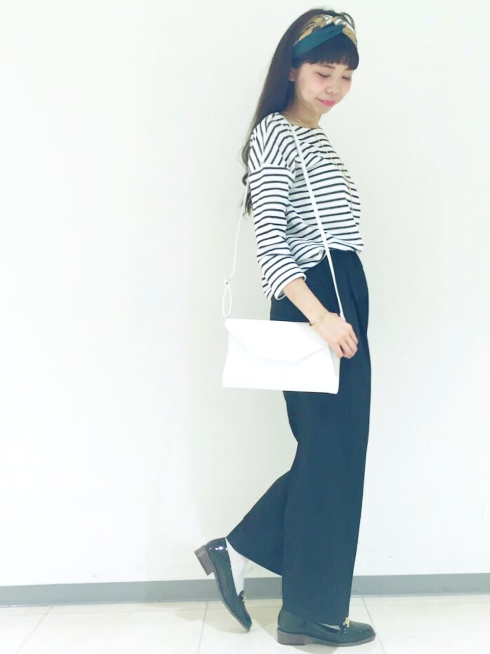 こんにちは。 今日は、モノトーンでつくる 春のマリンスタイルのご紹介⚓️ ゆったりとしたワイドパンツには、 マリンスタイルには欠かせないボーダーの トップスをインにして、バランス良く。 トレンドのスカーフを合わせるだけで、 女子度もアップ💘💘