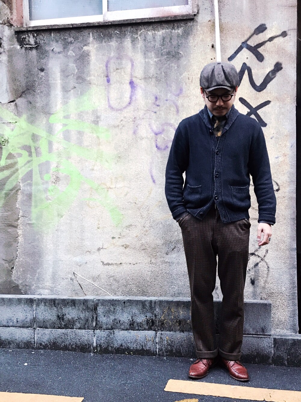 この背景は、みなさんと撮ったところです。高円寺。 千鳥のスラックスと ショールカーデでおじさんスタイル。