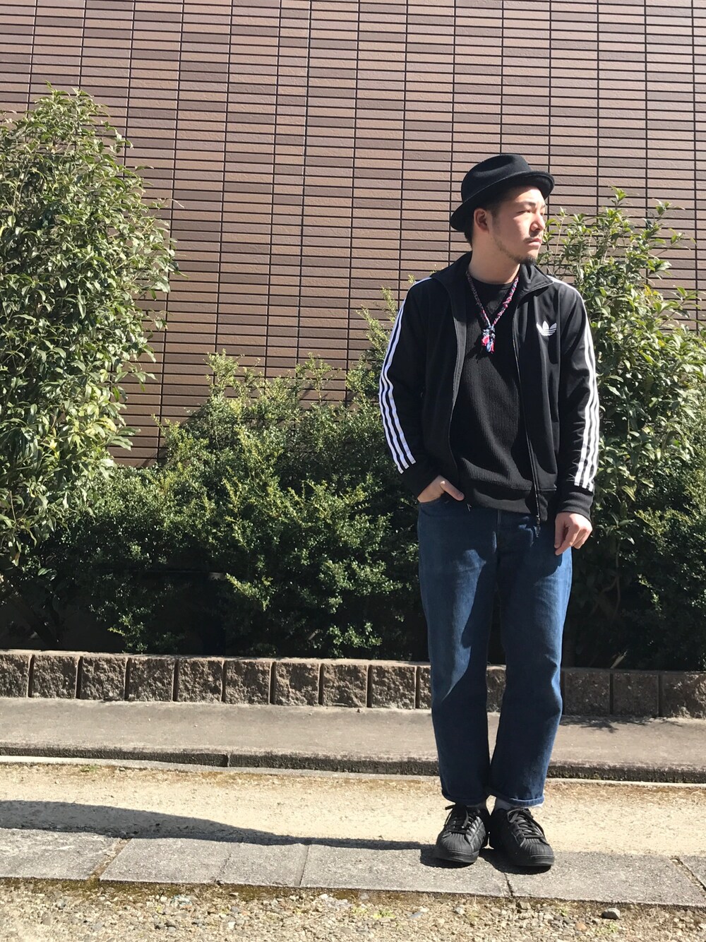 ジャージとスウェットで オフなスタイル。 Levi'sは501xx vintageモノでもなんでもないから 裾はセルフカットして半端丈に。 これがまた使える。 スニーカーとの相性が増しました。 ジャージに合わせて足元は スーパースター。