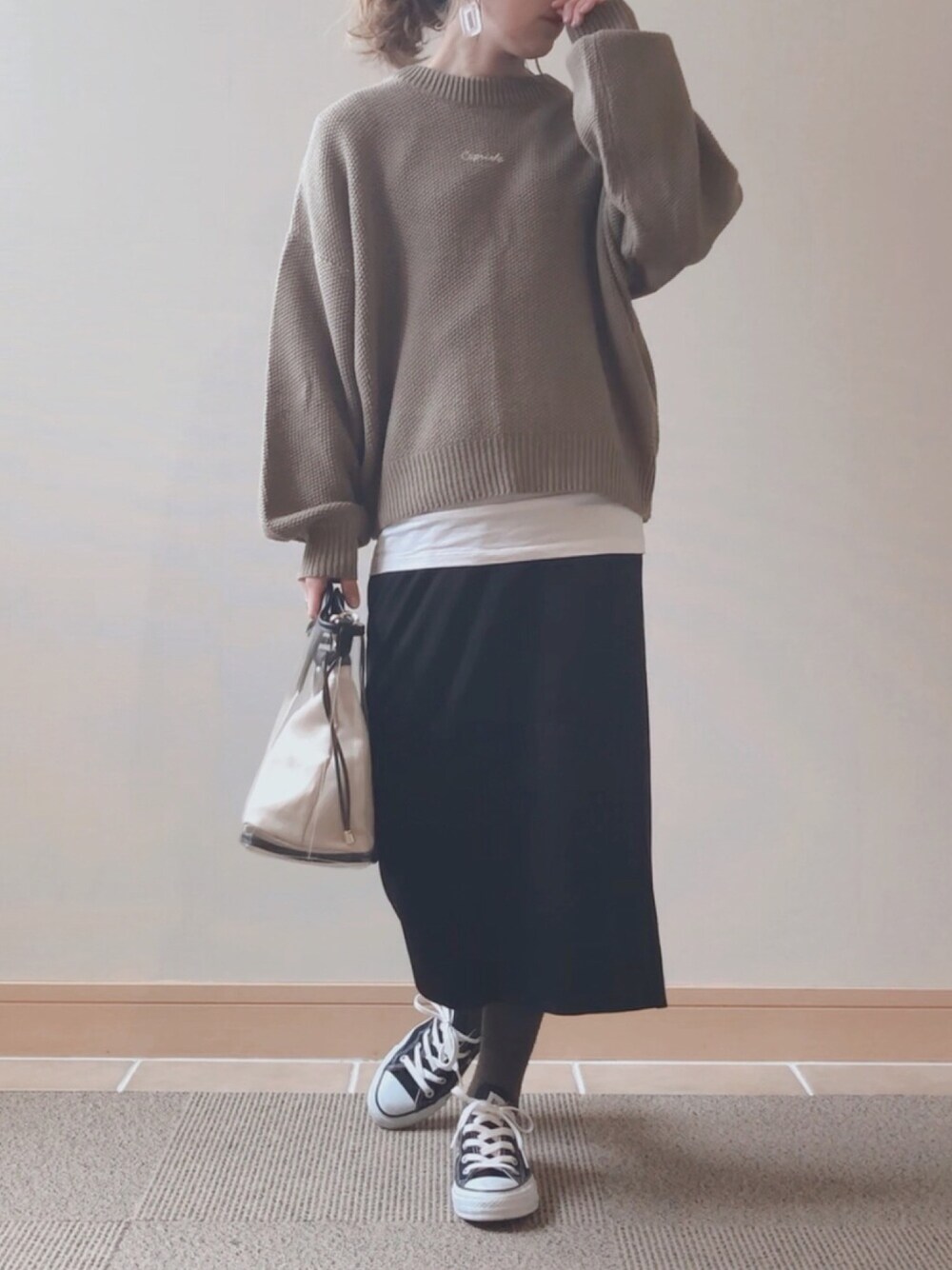 ミニロゴニット♡ インナーはzozoのストレッチUネックTシャツです👚 長めにオーダーしました--✂︎--- GOLDYさんのピアスもクリアでバッグと揃えてます♡