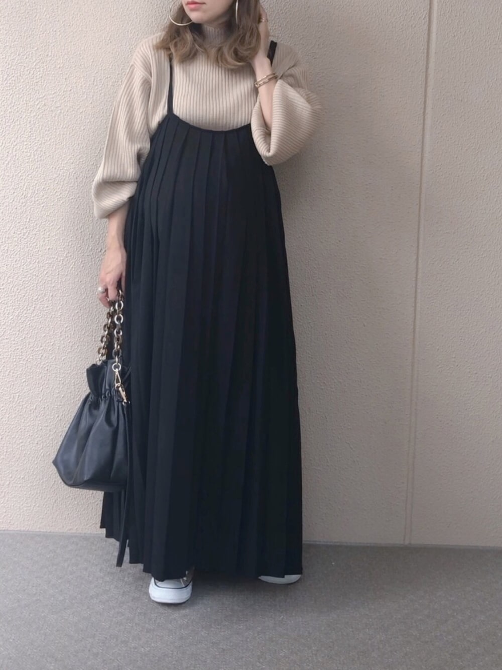 【Chaco closet】 ワイドスリーブハイネックニットトップス//ベージュ #着回しコーデ♡♡♡ ひっさびさにプリーツワンピ引っ張り出したらお腹にゆとりがあっていいやないの👯♀️ 覗いて頂いてありがとうございました!! Instagram➠saya_e__wear