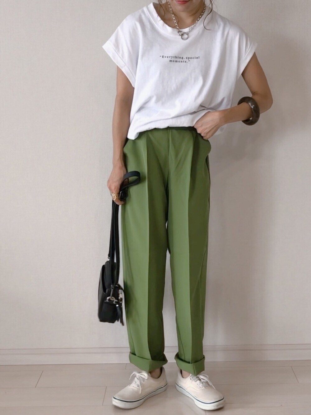 【ap retro】 カラーセンタープレスパンツ グリーンカラーが綺麗で可愛い🌿 #白スニーカー ____✍︎ 𝑇ℎ𝑎𝑛𝑘𝑠♡ Instagram➣➣saya_e__wear