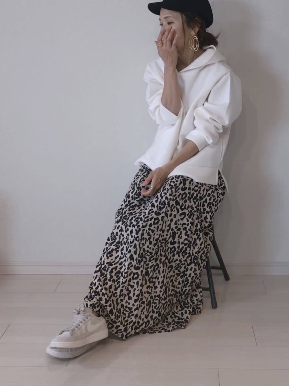 パーカーが着たくなる季節🍂 【Ambre Neige】 パウダリーパーカー(パウダーのようなサラサラ感。マシュマロのようなモチモチ感。) ホワイト//Mサイズ さらさらもちもちホントにそんな着心地♡ 🤍本日ZOZOにて500円offチケット出てます🤍 レオパードスカートで秋仕様です。