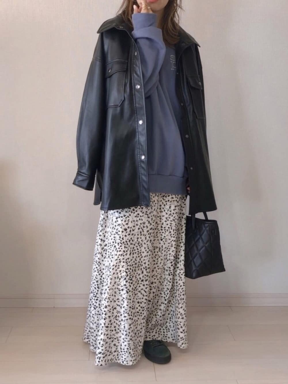 【ap retro】 エコレザーオーバーシャツジャケット ゆるっと着れるやつ。 重くならないように、、 中はカラースウェットに花柄スカート。 羽織ってもよし🙆♀️ 脱いでも良し🙆♀️ ____✍︎ 𝑇ℎ𝑎𝑛𝑘𝑠♡ 𝕝𝕟𝕤𝕥𝕒𝕘𝕣𝕒𝕞➣➣saya_e__wear