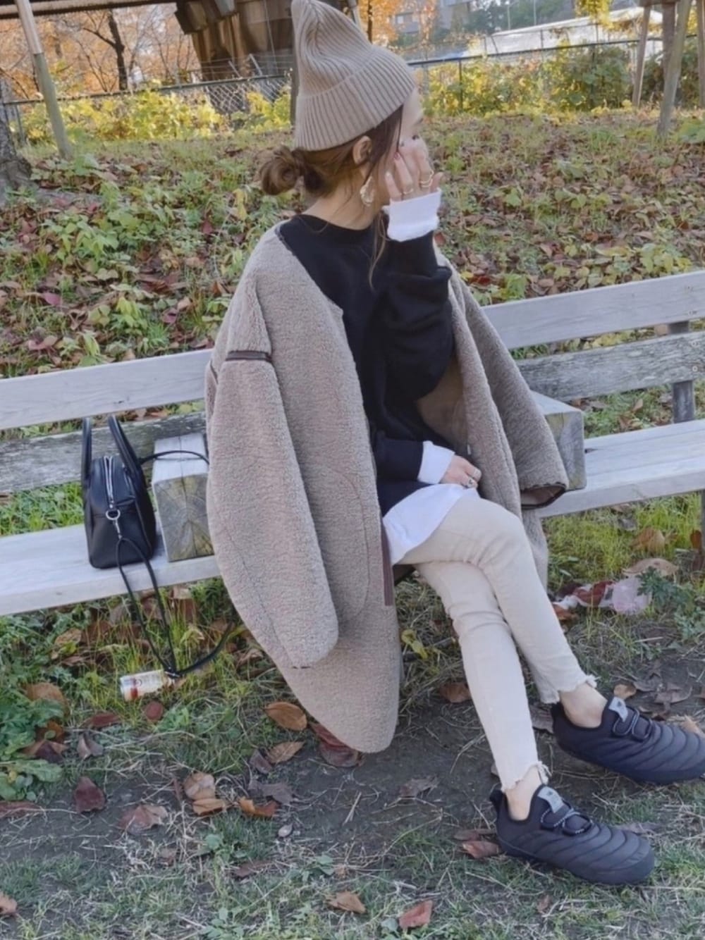 𝚜𝚊𝚢𝚊のムートンコート「WEB限定 フェイクムートン/パイピングボアコクーンコート」を使ったコーディネート
