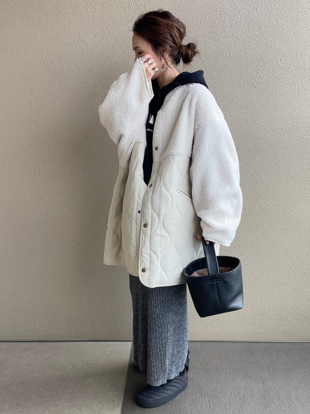 𝚜𝚊𝚢𝚊のノーカラージャケット「マットタフタ ボア切り替え M65 キルティングショートコート」を使ったコーディネート