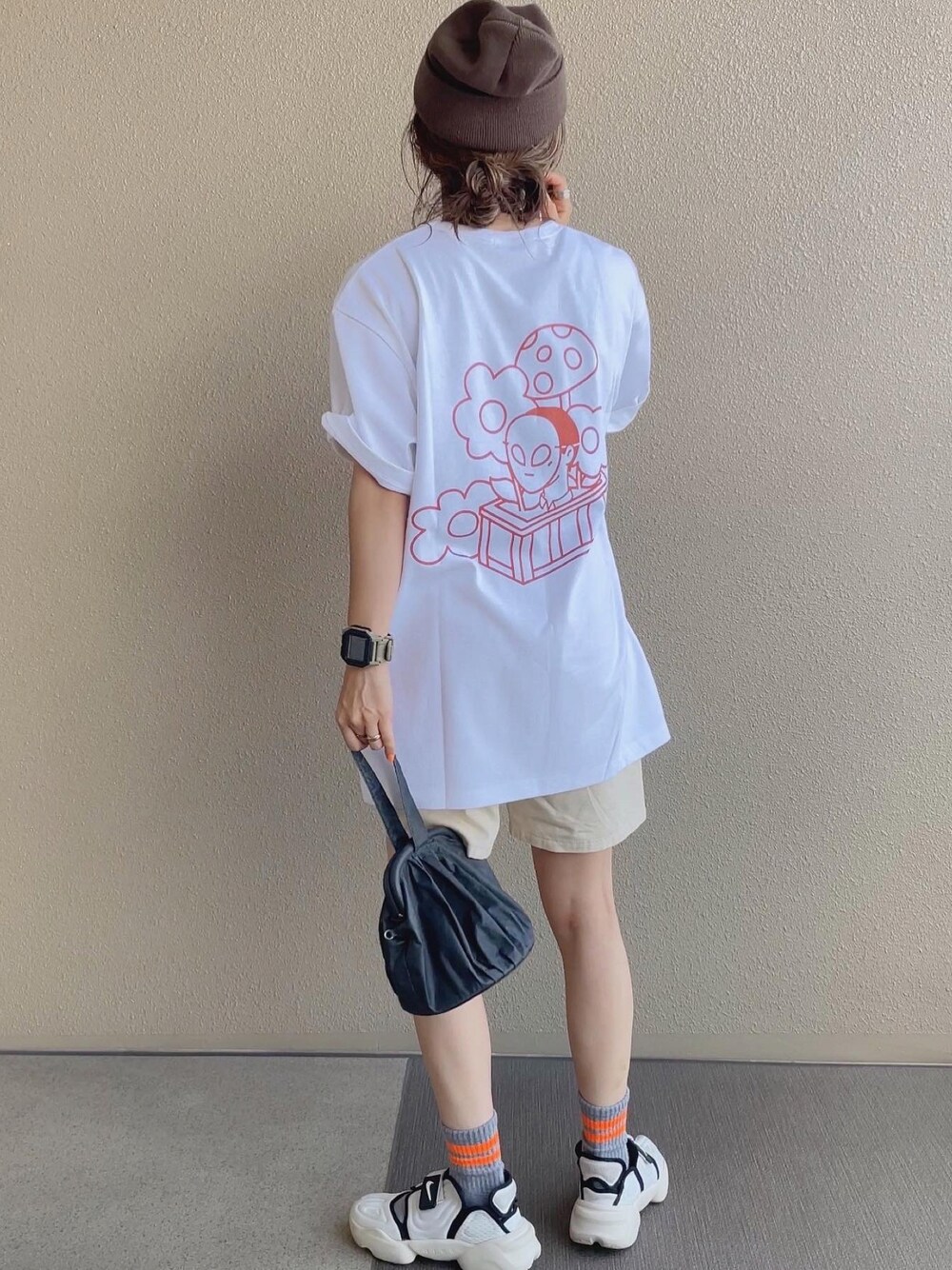 \夏のTシャツ着回しコーデ/ 第2弾𓂃 𓈒𓏸◌ ⋆ ⋆ 【Not so ape】 後ろのイラストが可愛いTシャツ👽 胸元にもミニエーリアンがいるよ💕 ショートパンツに… ベスト合わせに… カラーパンツ🌈🌈 ⋆ ⋆ インスタもよろしくです🫰🏼 saya_e__wear