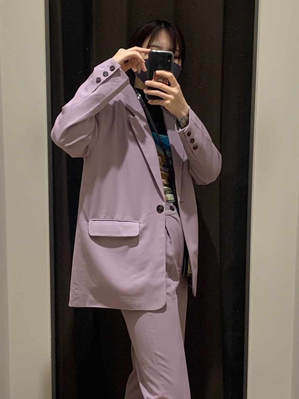AZUL by moussyのセットアップを主役に着用 藤色のセットアップ、生地感は滑らかでしっかりとしています。上はダブルジャケットになっており襟元ががっと空いたデザインになっています。袖には3連のボタンが付いており時計やバングル等がなくても寂しさを感じさせません。 インナーにはシンプルなハイネックのブラックリブニットの上から色彩のあるzaraのチューブトップを忍ばせています。こちらのチューブトップは薄手でスクエアネックになっているためインナーを着る場合は襟元で遊ぶのが良いと思います。 パンツはハイウエストになっているのでトップスは短めの物を選ぶかタックインしてもらえると脚長効果ありです。 藤色が春にピッタリなコーディネートです。