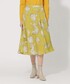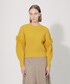 イエローのカラーが印象的なスタイリングです。メリノウールのソフトなタッチと暖かさが特徴で、オリジナルプリントのスカートとのバランスがとても良いです。スカートのシルエットはとても綺麗でウエストは後ろがゴム仕様になっていますので楽な履き心地です。