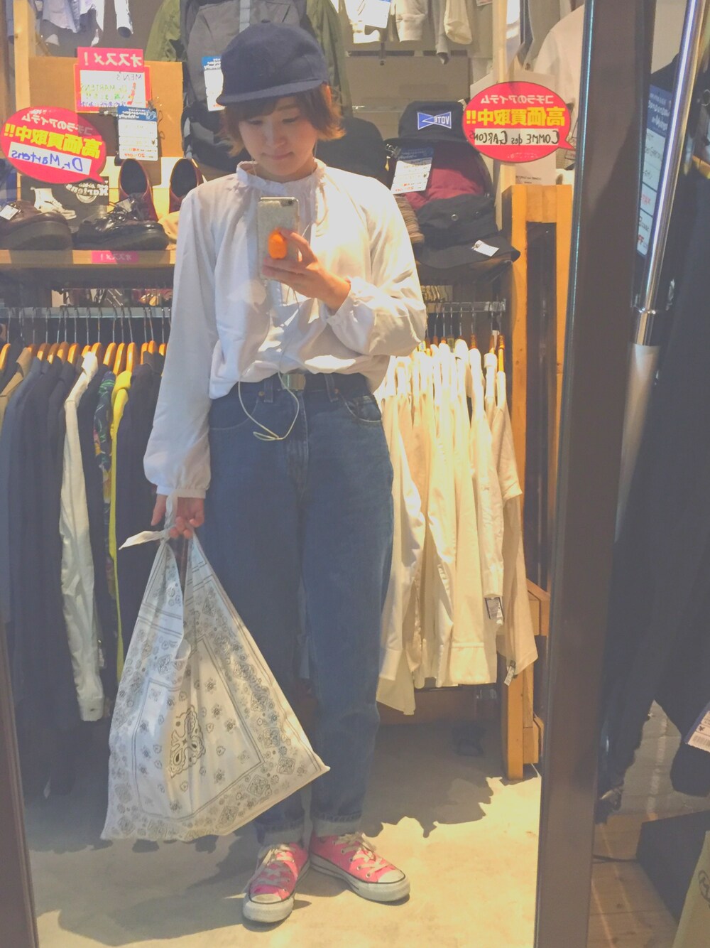 スニーカーのピンクとバンダナ柄バッグを目立たせたくて他はシンプルに。 シャツはシンプルなんだけど素材感や形、襟部分がお気に入りです。 このデニムはやっぱり形が可愛いです😊